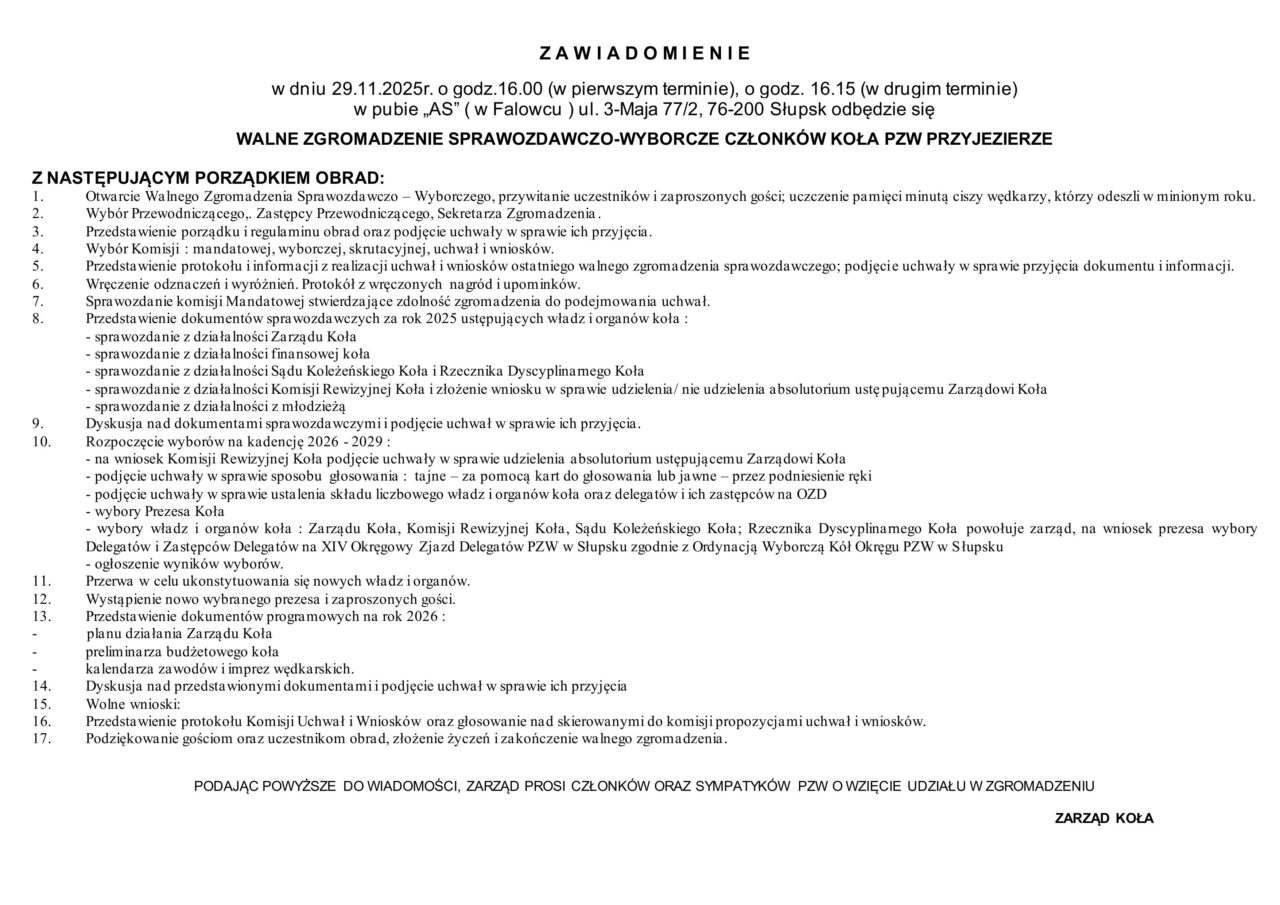 WALNE ZGORMADZENIE SPRAWOZDAWCZO-WYBORCZE CZŁONKÓW KOŁA 29.11.2025 r. godz 16:00 ADAM 22 października 2025 Aktualności Post Views: 179 Nawigacja wpisu Poprzedni Poprzedni wpis: Towarzyskie zawody 18.10.2025 Stawek ŁabędziNastępny Następny wpis: Siemianice, zamknięcie stawków numer 3 i 4 od 20.11.2025 r.